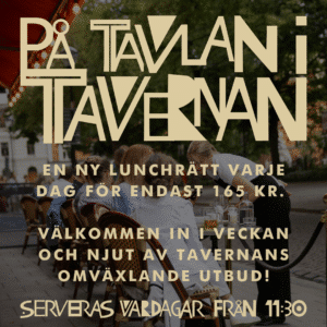 Måndag-fredag från 11.30 ”På tavlan” – en delikat utvald rätt för endast 165 kr serveras så länge ”lagret” räcker!